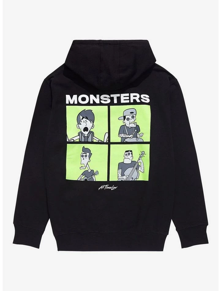 Why do all the monsters come out at night? We don’t have the answers, but we do have this All Time Low hoodie. Inspired by the band’s single “Monsters” featuring Demi Lovato and blackbear, it features the bands logo on the chest and a grid of the band members as cartoons on the back, with the song title up top. Drawstring hood and front kangaroo pocket.