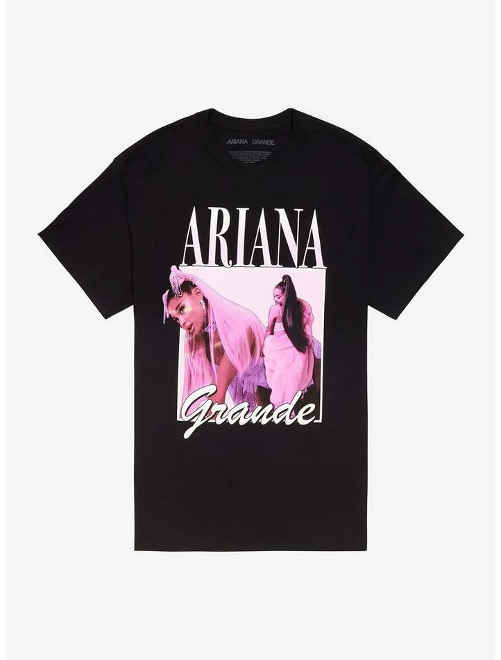 Looking to add a new Ari tee to your wardrobe? You see it, you like it, youΒ want it, youΒ got it! Rep Ariana Grande in her “7 Rings” era with this tee, featuring the singer in her signature outfits from the music video framed in a white box, and her name in different fonts around the border.