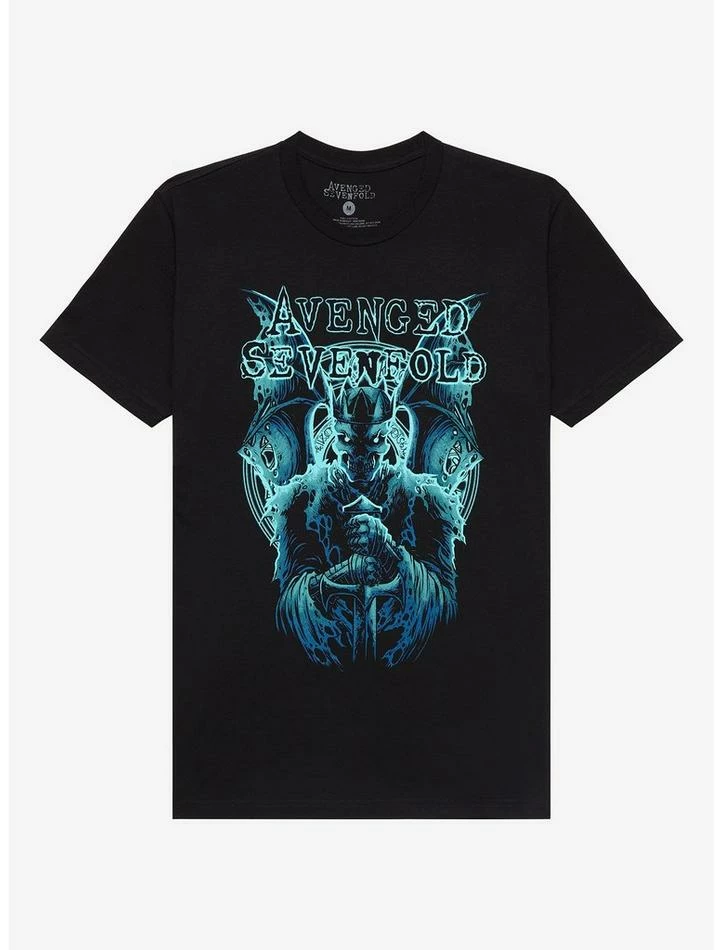 Need a new Avenged Sevenfold tee? This style features an ominous portrait of a skeleton king with a crown and sword, and the band logo above.