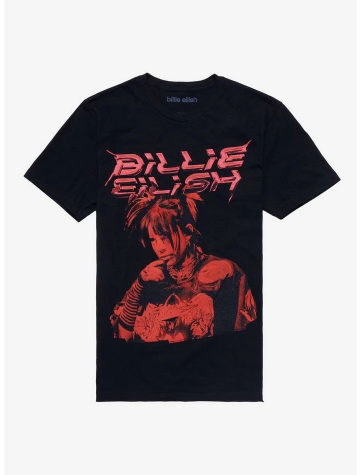 Craving a new Billie Eilish tee? Try this one, which features a red portrait of the singer and a futuristic-looking logo.