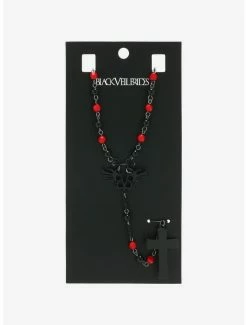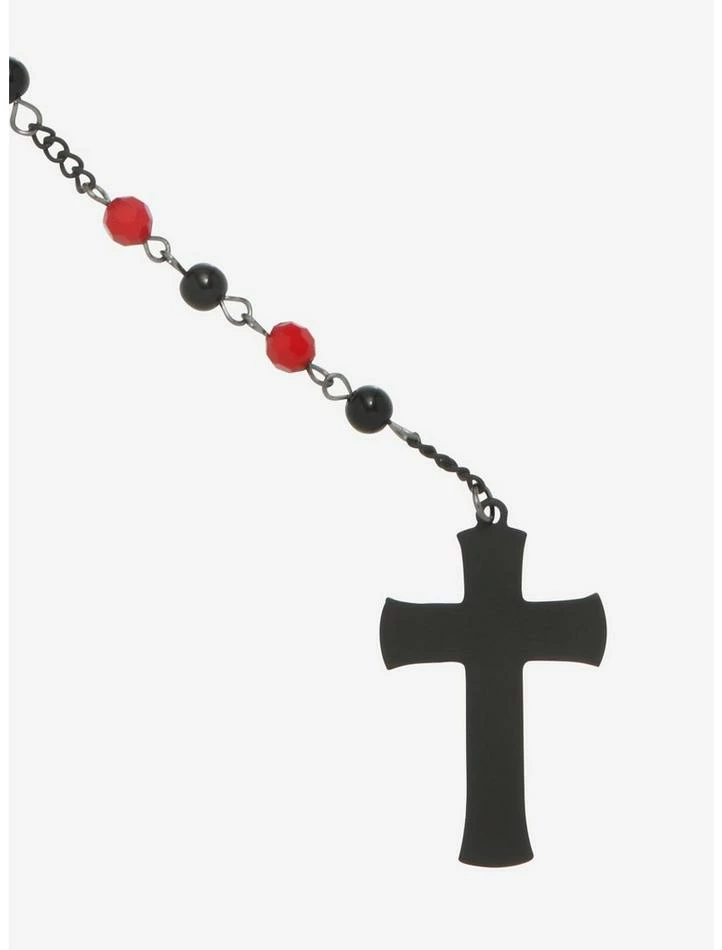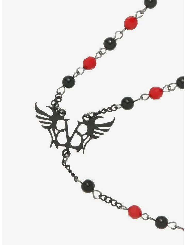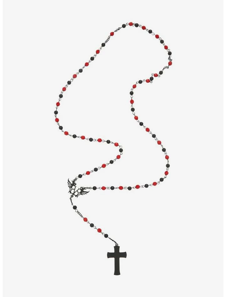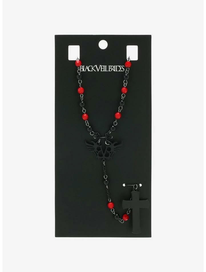 Those with a heart of fire, you’ll need some fresh new jewelry for your next BVB concert! It ain’t a scarlet cross, but this rosary necklace has a statement black cross pendant at the end, with red & black beads strung throughout and the Black Veil Brides logo as a center charm.
