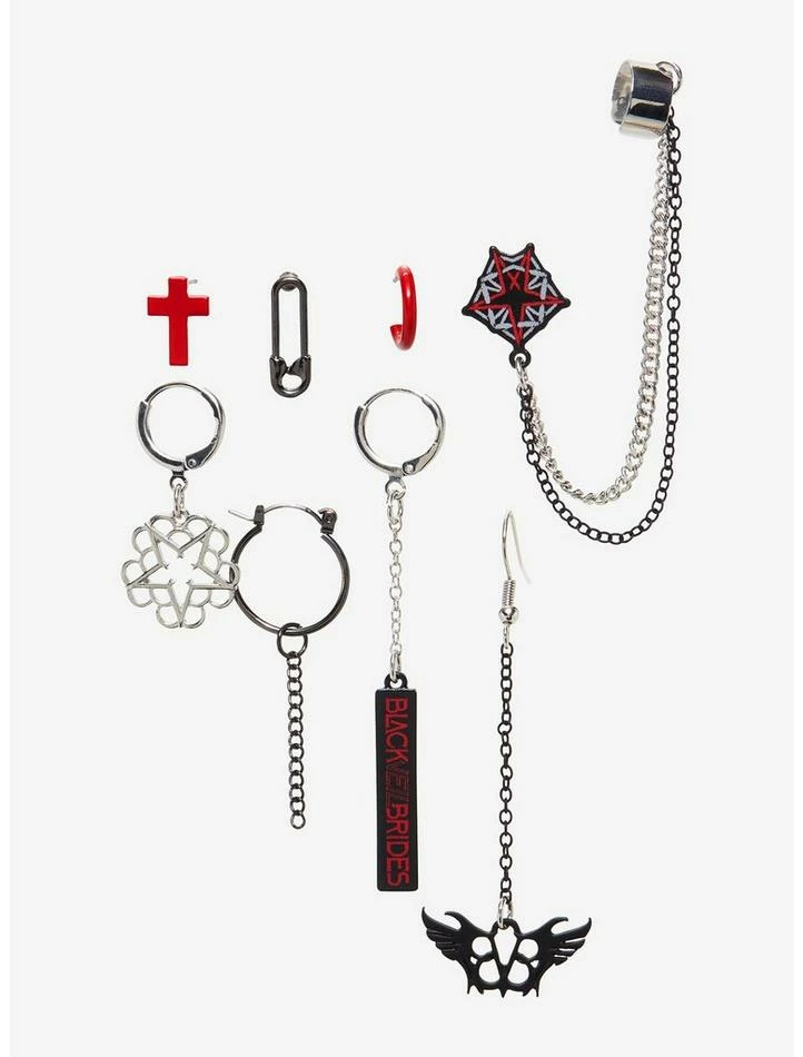 Excited for Black Veil Brides’s next show? Complete your concert ‘fit with some killer earrings! This set includes mismatch stud and drops featuring a cross, safety pin and the band’s various logos.