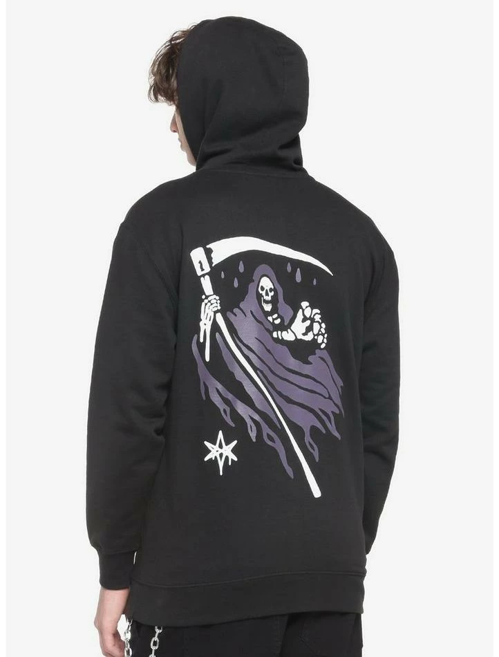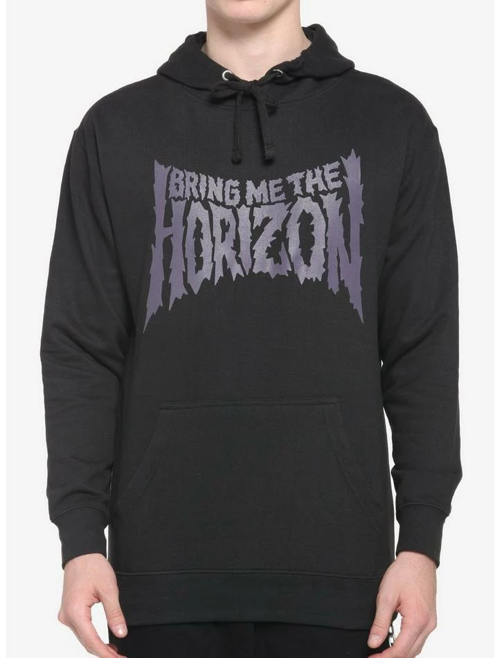 No bad habits here, just rad hoodies inspired by your fave band, Bring Me The Horizon. This one features the text logo in a jagged font in dark purple on the front, and a grim reaper floating on the back. Drawstring hood and front kangaroo pocket.