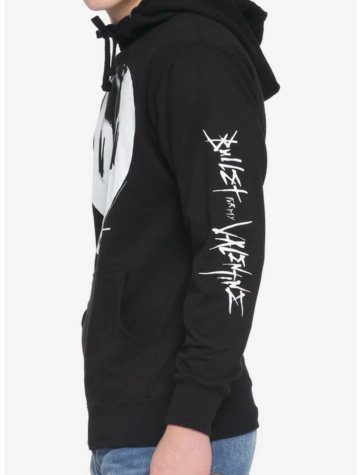 Loving “Shatter” and “Knives”? Get hyped for their brand new album with this hoodie! Featuring the album’s cover art on the front and “Bullet for my Valentine” printed down the sleeve. Kangaroo pocket and drawstring cords.