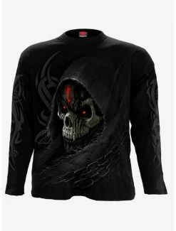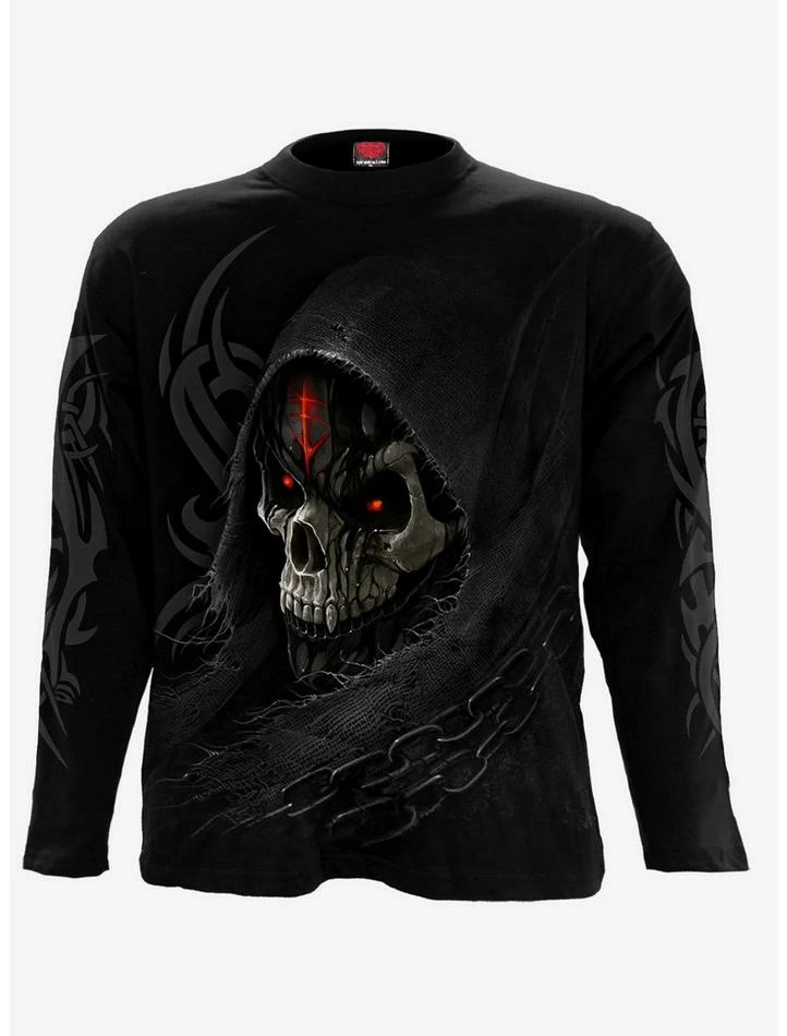 The blackened, dripping tar of mortality drips continuously from the skeletal mask of Death. Blood red eyes splinter the darkness, while the ever-tightening chains suffocate and imprison. These are the end times, and we are the marked few. Long sleeve T-Shirt Black is made of Top Quality 100% Cotton, Jersey using skin friendly, Azo-free, Reactive dyes.