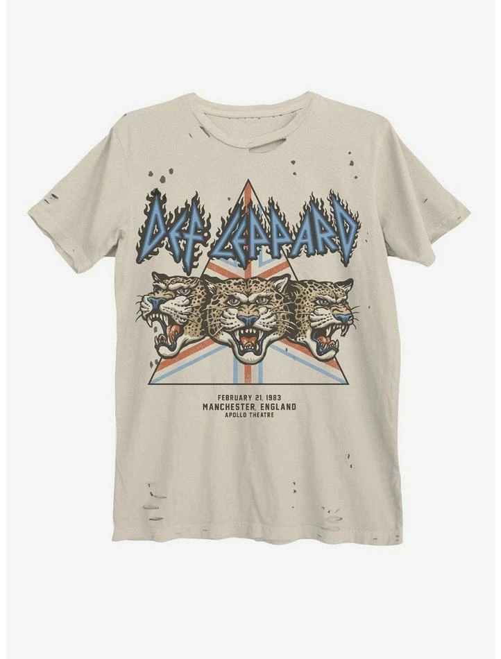 February 21, 1983, at the Apollo Theatre was Def Leppard’s first Manchester show since the band’s High N’ Dry tour in 1981. Pyromania had just dropped and shot the band to stardom. This tee commemorates that pivotal moment in the band’s career. It has pre-made holes and distressing throughout so the style looks vintage.
