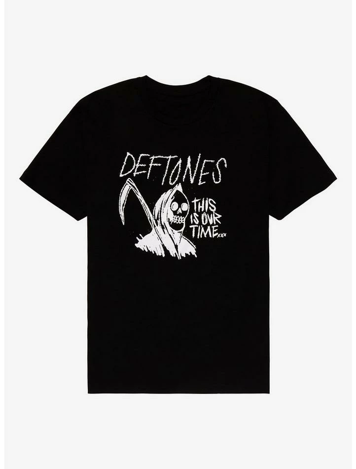The only way you’ll slip into a hopeless sea of regret is if you don’t snag this Deftones tee! Featuring a graphic of the Grim Reaper with “This is our time” and the band’s text logo above.