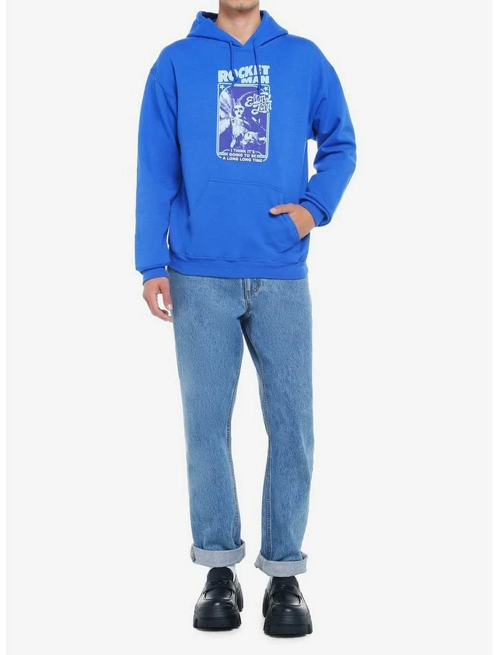 Cue one of the best songs ever written! This blue hoodie honors “Rocket Man” by Elton John with an image of John looking fabulous on the front, plus the song name and some lyrics from the chorus. Drawstring hood and front kangaroo pocket.