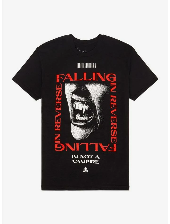 Vamp up your band tee collection with this Falling In Reverse one! Featuring a close up image of vampire fangs, framed by the band’s name repeated in red, and “I’m not a vampire” below.