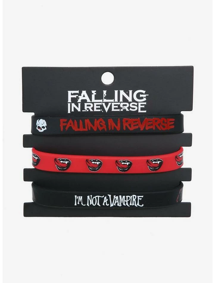 Take a bite out of this Falling In Reverse rubber bracelet set! Featuring bracelets with their band name, vampire lips and “I’m not a vampire.” The perfect finishing touch to your concert look!