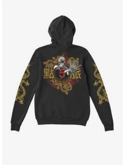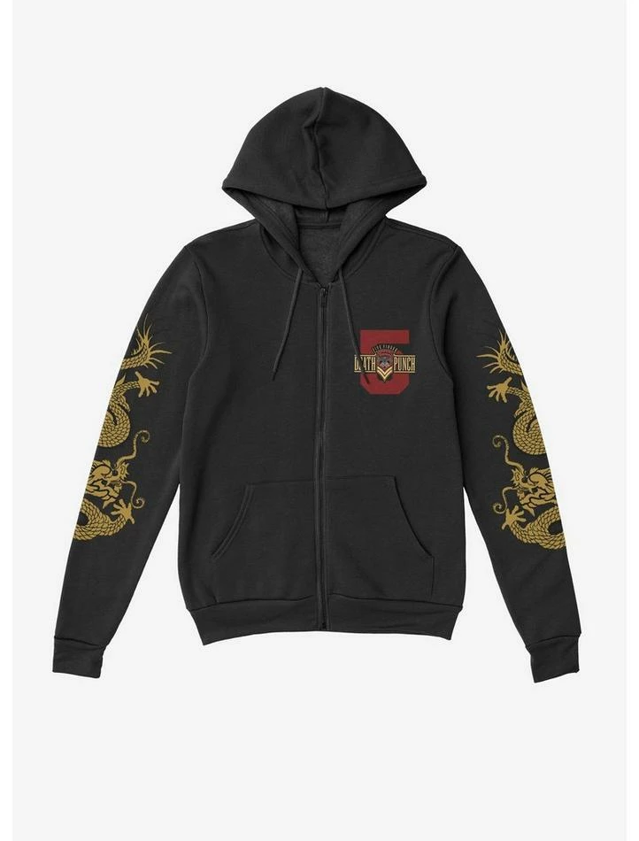 Getting chilly? Trade in your band tee for a band hoodie! This Five Finger Death Punch one features their logo at the chest, with ornate dragon graphics down the sleeves and on the back. Comes with a drawstring hood, kangaroo pockets and a front zipper closure.