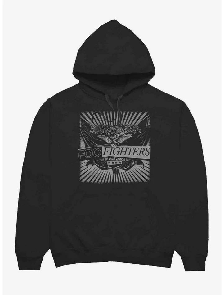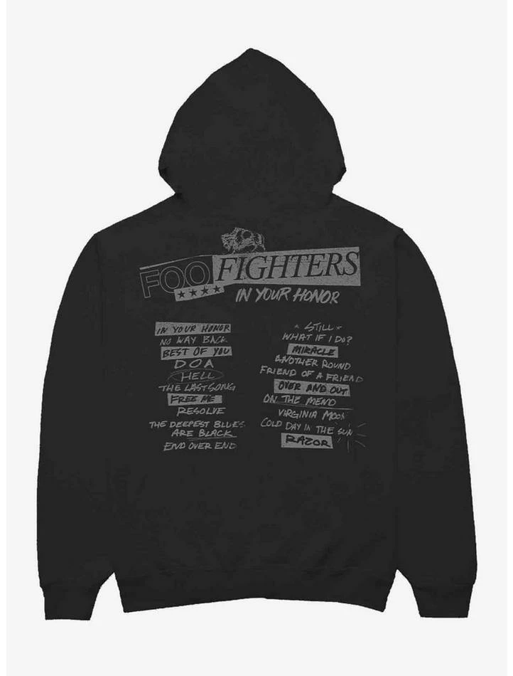 The epic double album by Foo Fighter, In Your Honor (2005) is a classic in our book. This hoodie pays homage to the LP with a list of the tracks on the back. Drawstring hood and front kangaroo pocket.