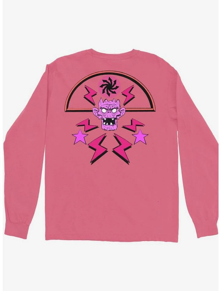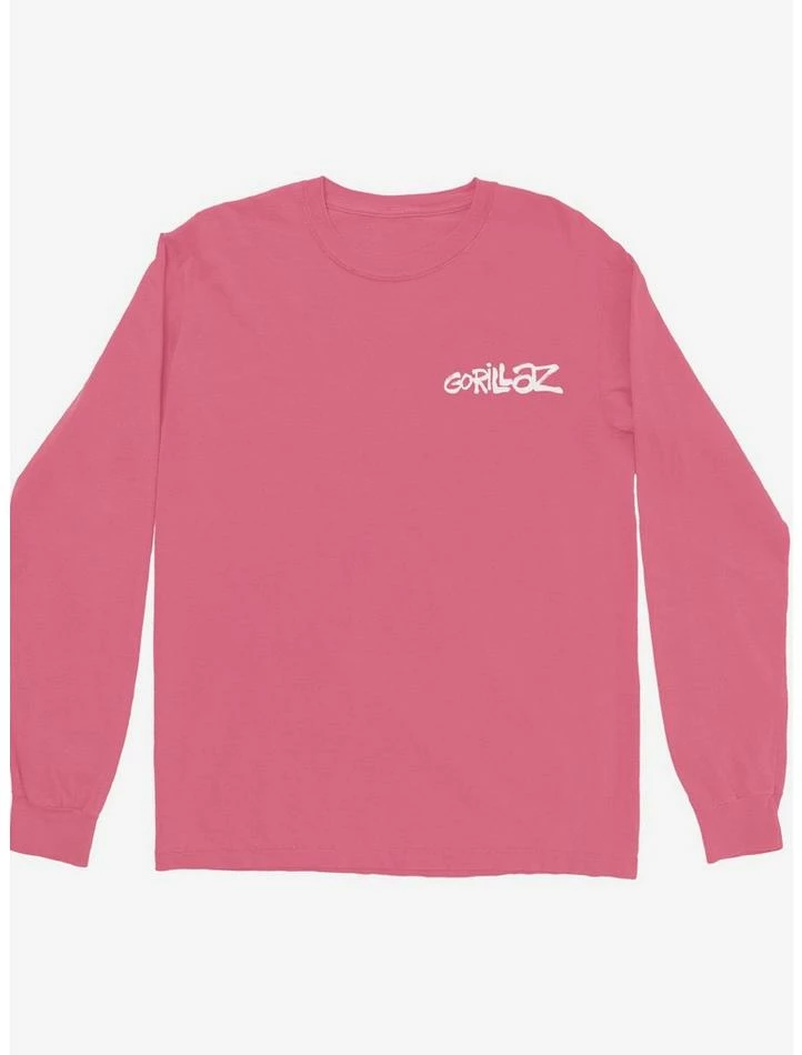 Gorillaz are back with a pink long-sleeve to shake up your tee drawer. This one will help you stand out at the next show. It has the band logo on the front chest, and on the back it has a stylized gorilla face plus stars and lightning bolts.