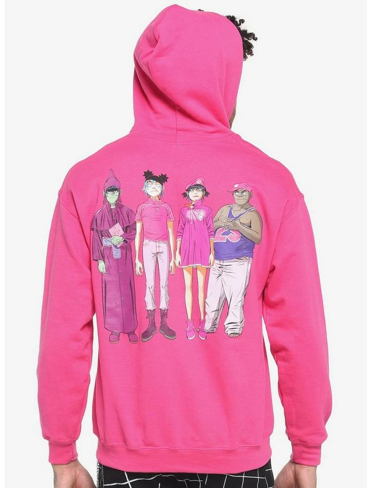 Gorillaz forever! This pink hoodie features the logo on the front and graphics of the members standing together on the back. Drawstring hood and front kangaroo pocket.