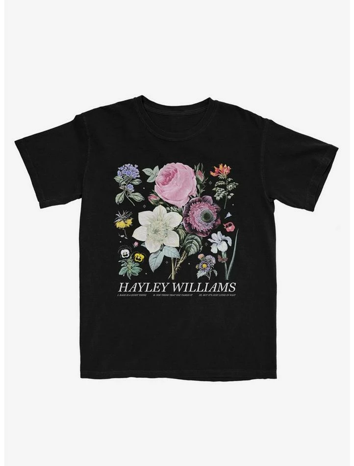 Need something more than petals for armor? This tee from Hayley Williams’ “Simmer” features a floral design. Underneath her name is “I. Rage is a quiet thing II. You think that you tamed it III. But it’s just lying in wait” text design.
