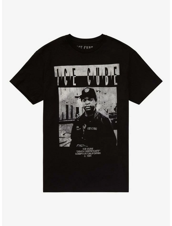 Lookin’ to add more rap tees to your rotation? Give this Ice Cube one a shot! Featuring a distressed black and white photo of the iconic rapper, with “Death certificate” and the release year for the album printed below.