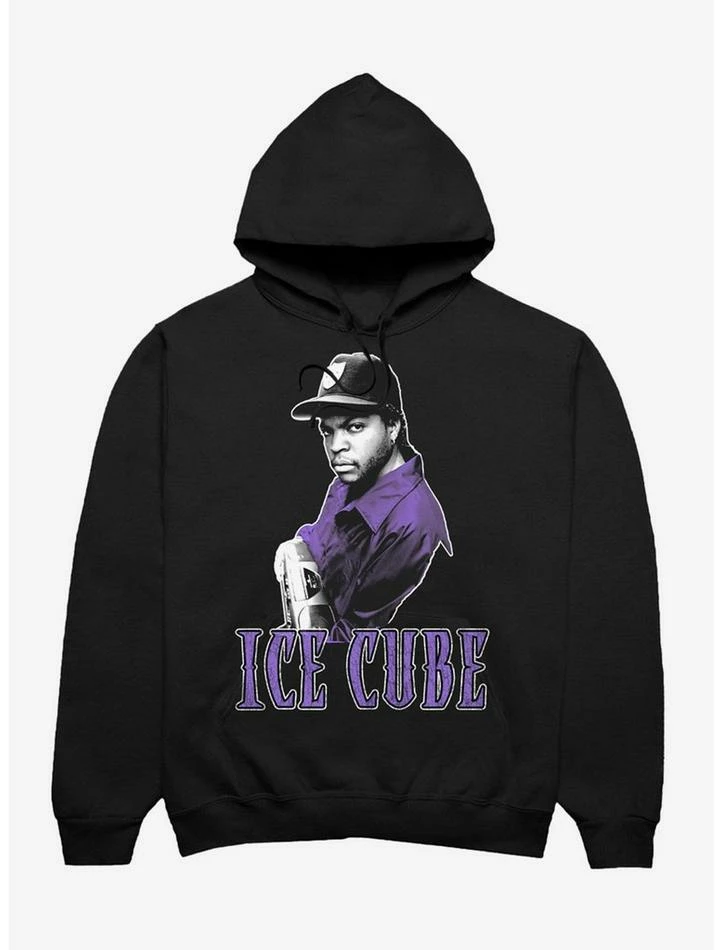 You know it’s a good day when there’s a new Ice Cube hoodie in your feed! This one shows a portrait of the rapper in a purple shirt, with a purple text logo to match. Drawstring hood and front kangaroo pocket.