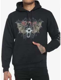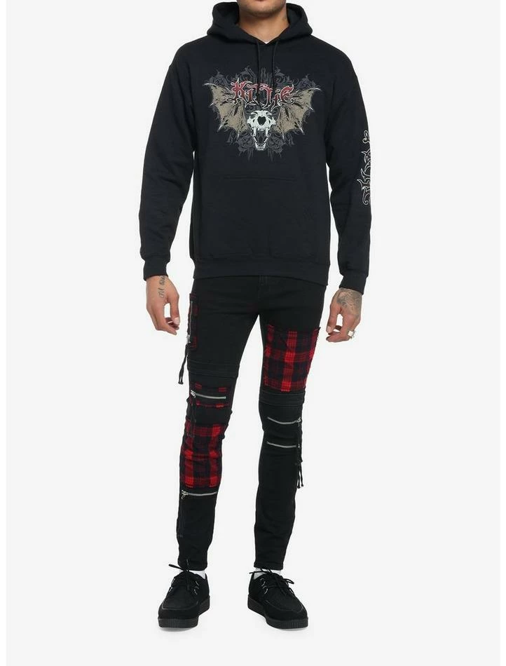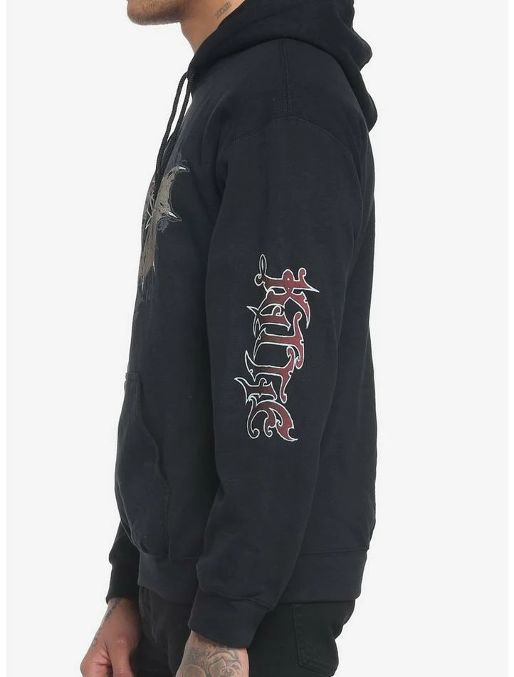 The baddie band Kittie is back in full force, so you need a fresh hoodie. This one features the band’s logo on the chest on down one sleeve, plus a large winged cat skull on the chest. Drawstring hood and front kangaroo pocket.