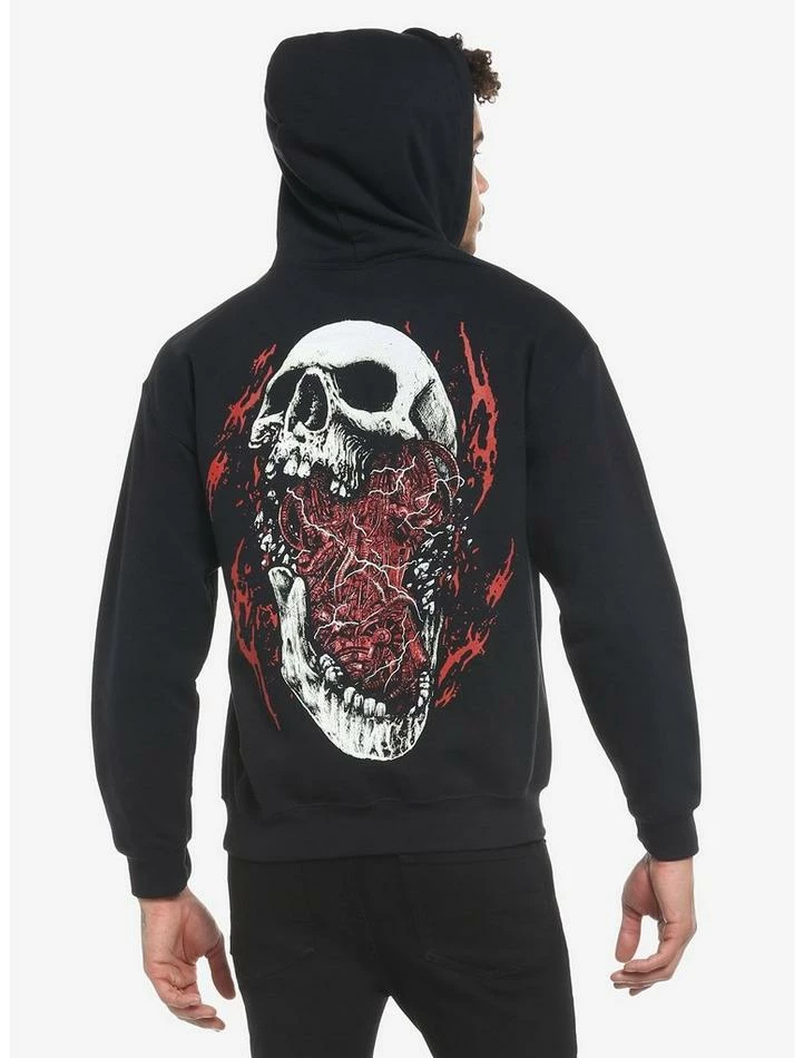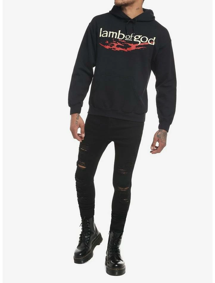 Gear up for Lamb Of God’s new Omens era with this badass hoodie. It features the band’s logo on the front, and a large graphic on the back of a skull with broken jaw and its mouth full of machinery. Front kangaroo pocket and drawstring hood.