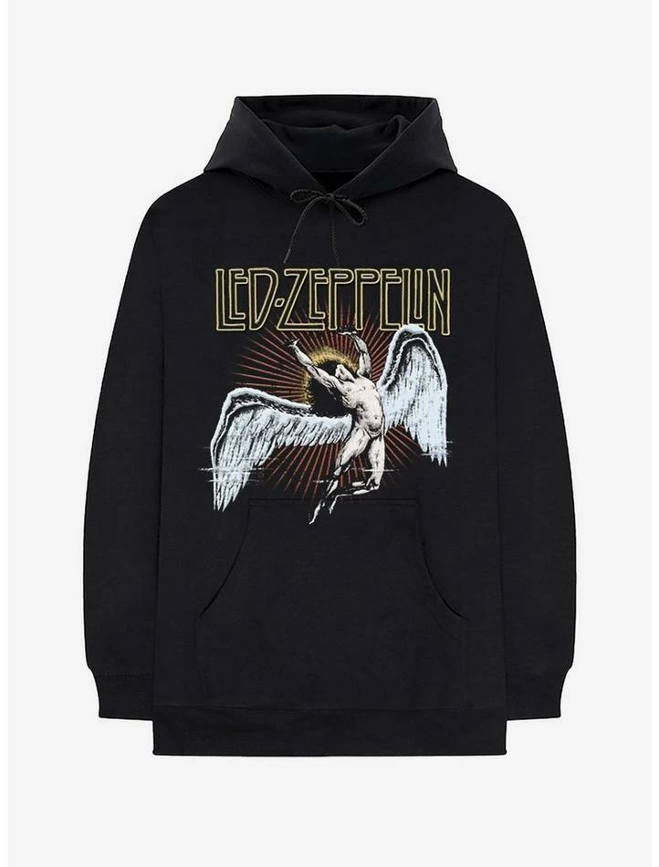 ย In 1973 Led Zeppelin started their own record label called Swan Song Records, with a dramatic logo of depicting Icarus reaching for the sun. This hoodie features that logo with the band’s name up top. Drawstring hood and front kangaroo pocket.