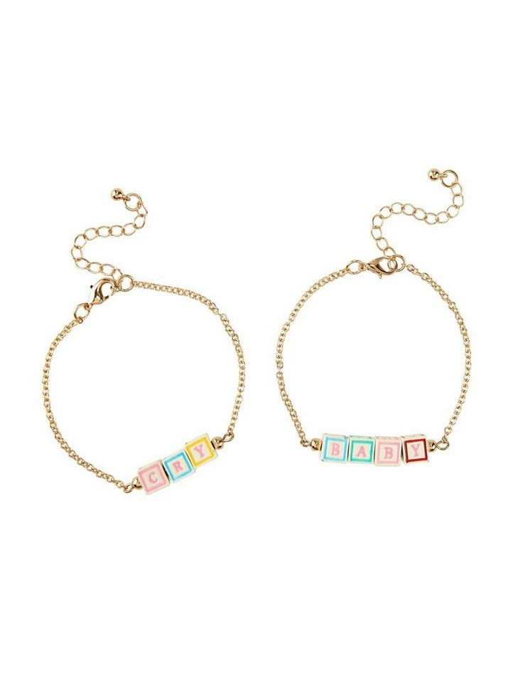 Gold tone chain bracelet set from Melanie Martinez featuring block letter designs on each that read “Cry” & “Baby.”