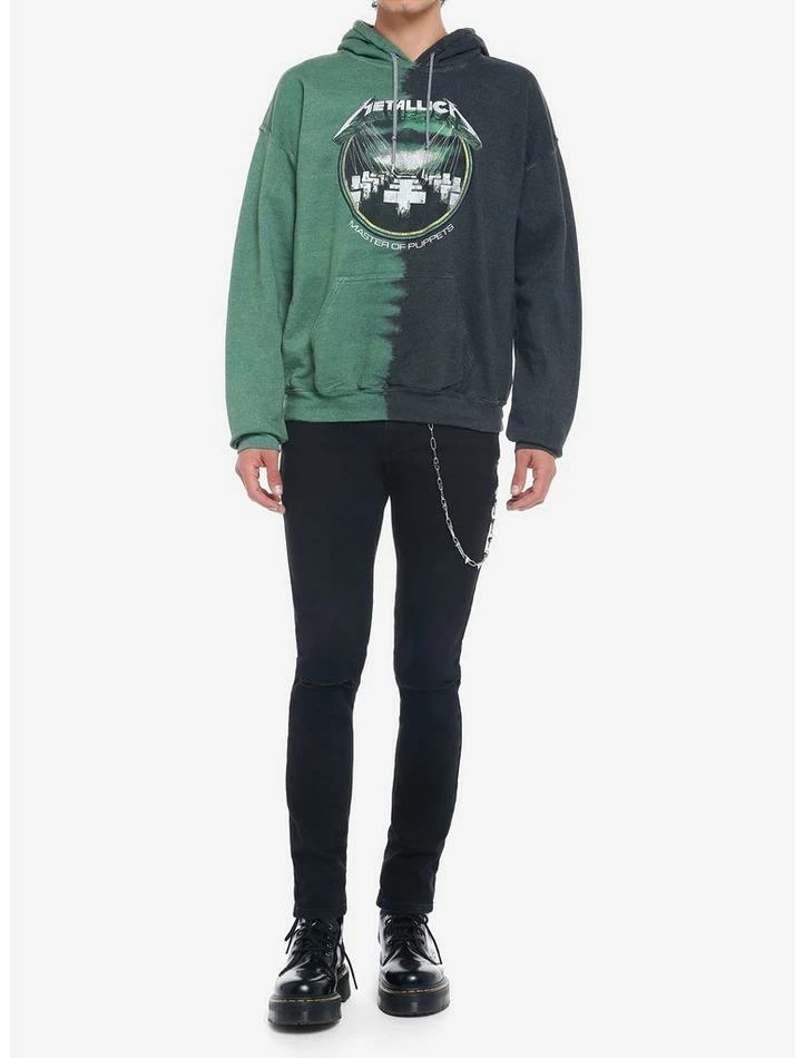 Looking for a fresh version of your classic Master of Puppets hoodie? Try this split-dye style featuring black and green, plus a tinted version of the album cover art. Drawstring hood and front kangaroo pocket.