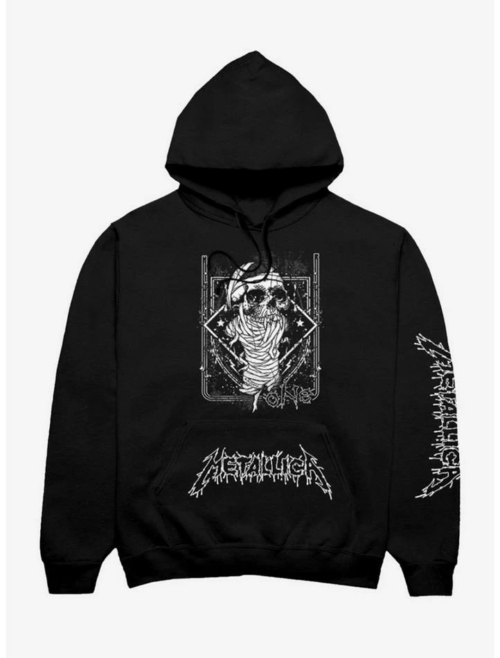 Darkness imprisoning you? Stay warm in this black hoodie from Metallica. Features a skeleton mummy on the front with “One” and “Metallica” on the left sleeve. Drawstring hood and “Metallica” on the front pocket pouch.