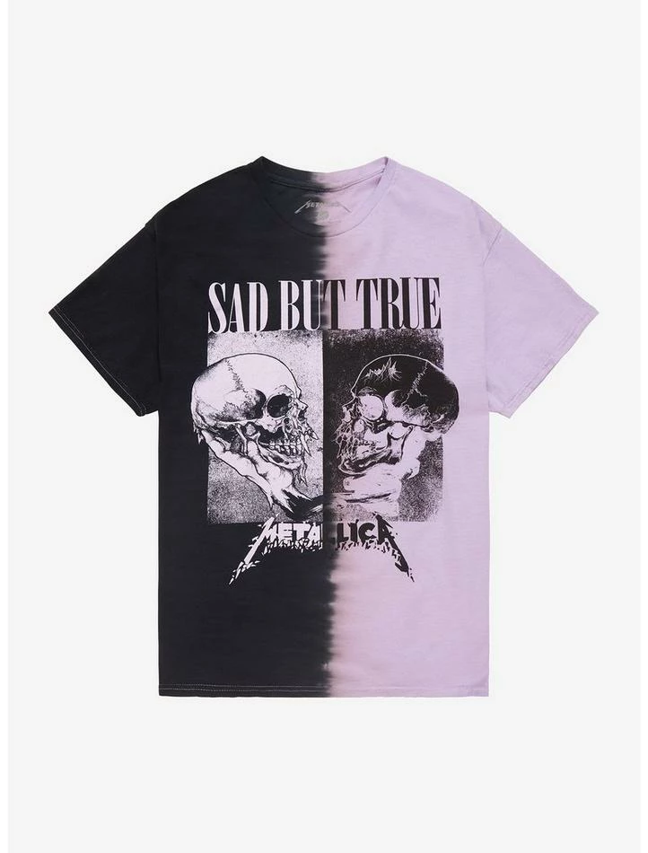 Β We put a new spin on the classic Metallica merch for you — this lavender and black split wash tee! It features text reading SAD BUT TRUE and mirror image skull graphics, with the Metallica logo below.