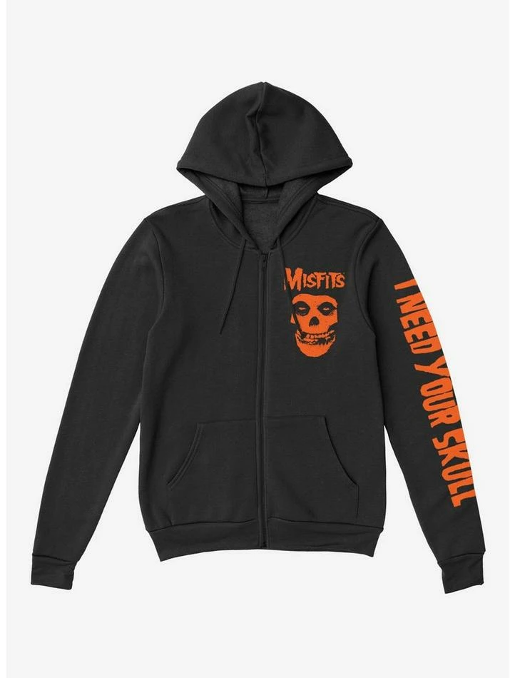 You need this zip-up hoodie. The orange and black zip-up number is decorated with Misfits emblems like the Fiend’s face and the band’s text logo on the front, as well as lyrics from “Skulls” on the chest and arm. The back has a large image of the Fiend’s face. Front pockets and drawstring hood.