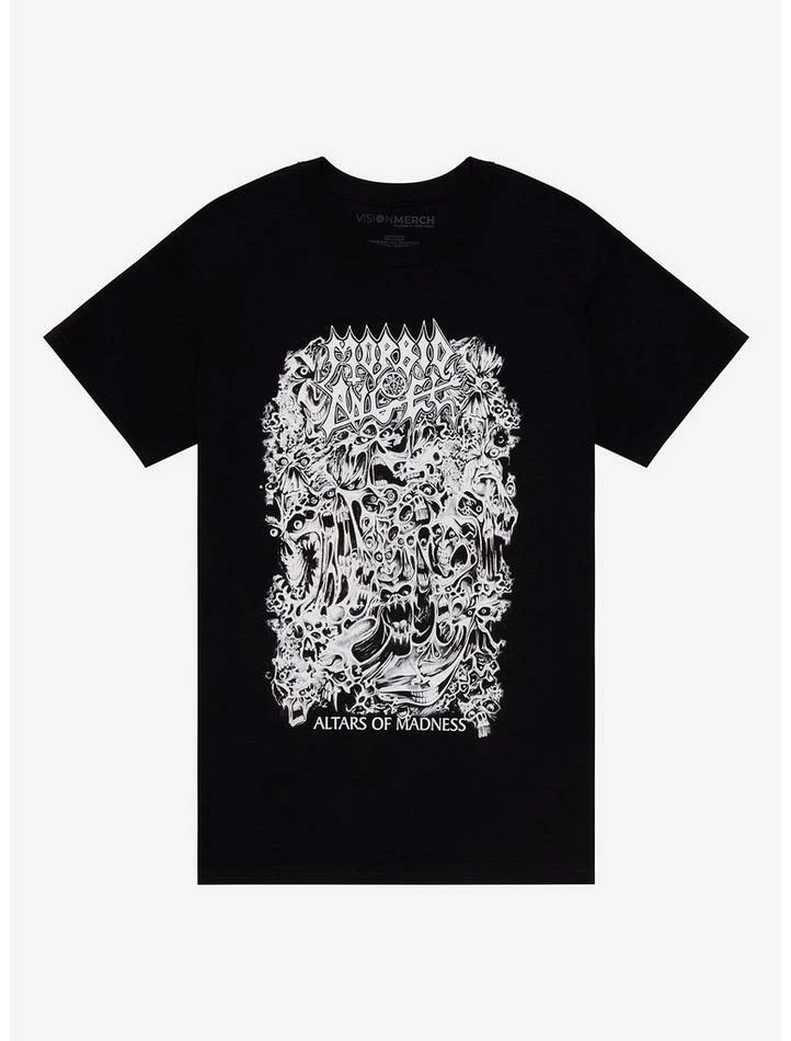 The debut album by Florida death metal album Morbid Angel still crushes all these decades later. Altars of Madness (1989) is considered one the albums that helped form the death metal genre, and remains one of the most influential metal albums of all time. This tee features an elongated version of the intricate, dark art from the album cover, along with the band’s logo and album name.