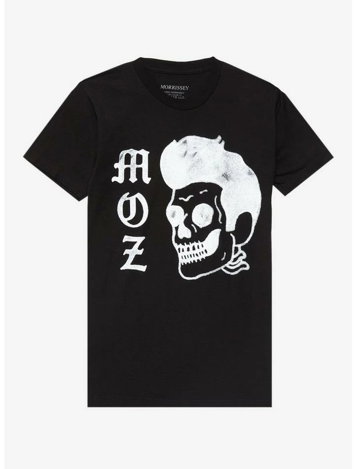 Need a Morrissey tee that’s a little more on a creepy cute side? This style is for you; it shows a skull with Morrissey’s signature hairdo, plus “Moz” written down the side in a spray paint-style font.