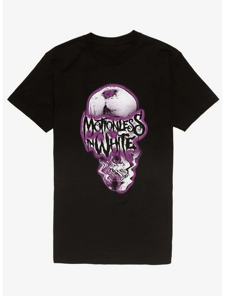 Ready to face your disguise? Grab this tee to rep Motionless In White. It features the band’s logo against a distorted, purple-tinged skull.