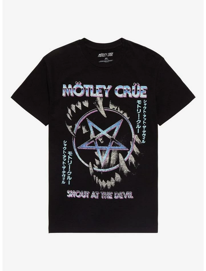 Mรถtley Crรผe’s Shout At the Devil (1983) album is as hard as hair metal comes, and it skyrocketed the band to popularity all over the globe. This tee honors the band’s big-in-Japan days with the pentagram from the album cover surrounded by teeth and kanji lettering. The album title is below, and the band’s name is above.
