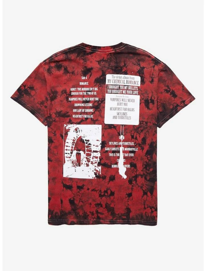Did you snag tickets for the upcoming My Chemical Romance tour? Then you’ll need a new MCR tee to wear to the concert! This red wash tee celebrates their debut album, I Brought You My Bullets, You Brought Me Your Love. The album’s title is highlighted on the front and the back showcases the album’s tracklisting and a CD ad.