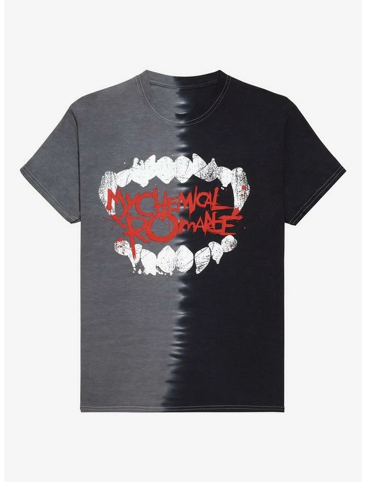 Sink your teeth into a new My Chem tee! This style is split dye for extra flair and shows a distressed graphic of fangs and the Black Parade-era logo.