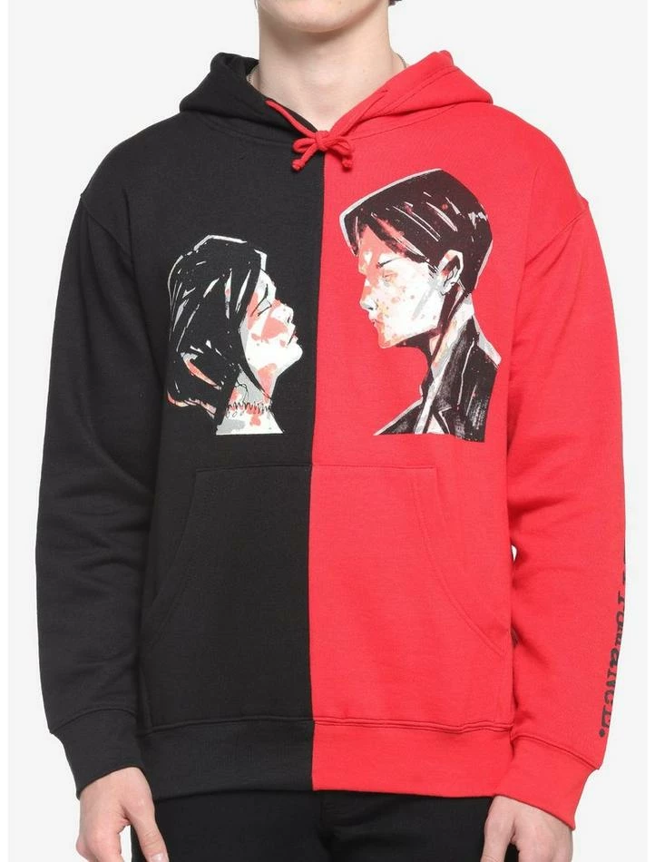 Give ’em hell in this split hoodie from My Chemical Romance! Inspired by Three Cheers for Sweet Revenge, the front shows the duo from the album cover, and the band’s text logo is on one sleeve. Front pocket and drawstring hood.