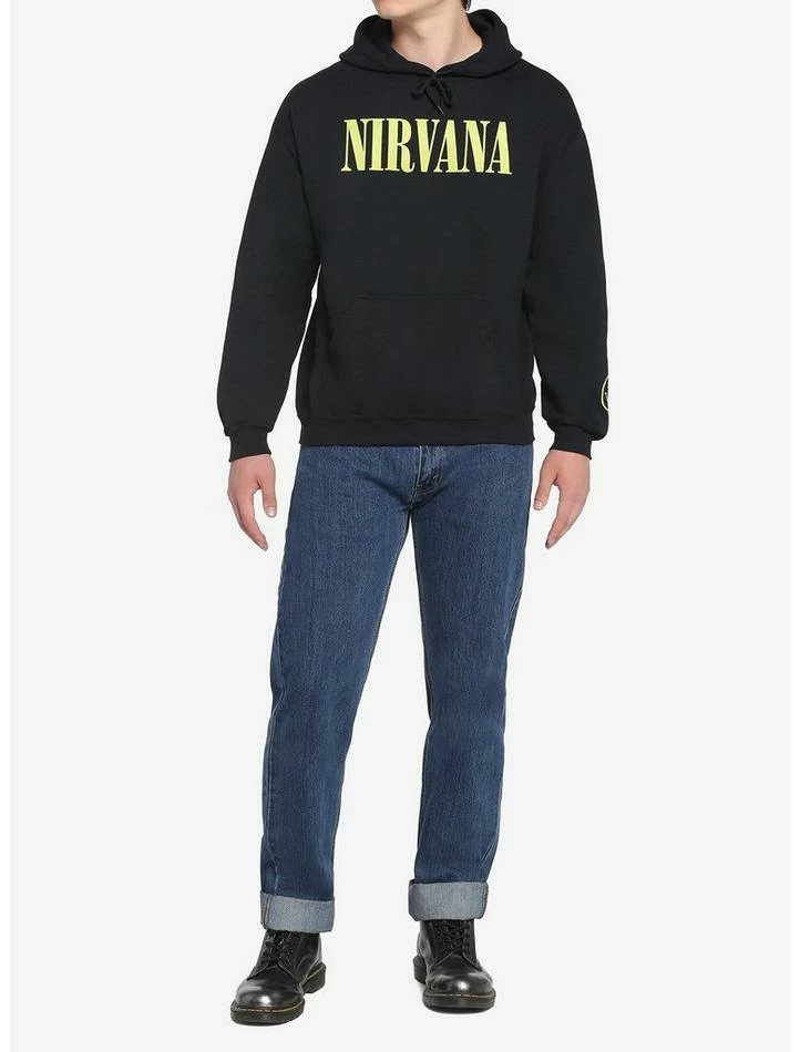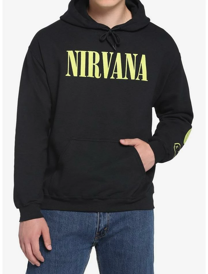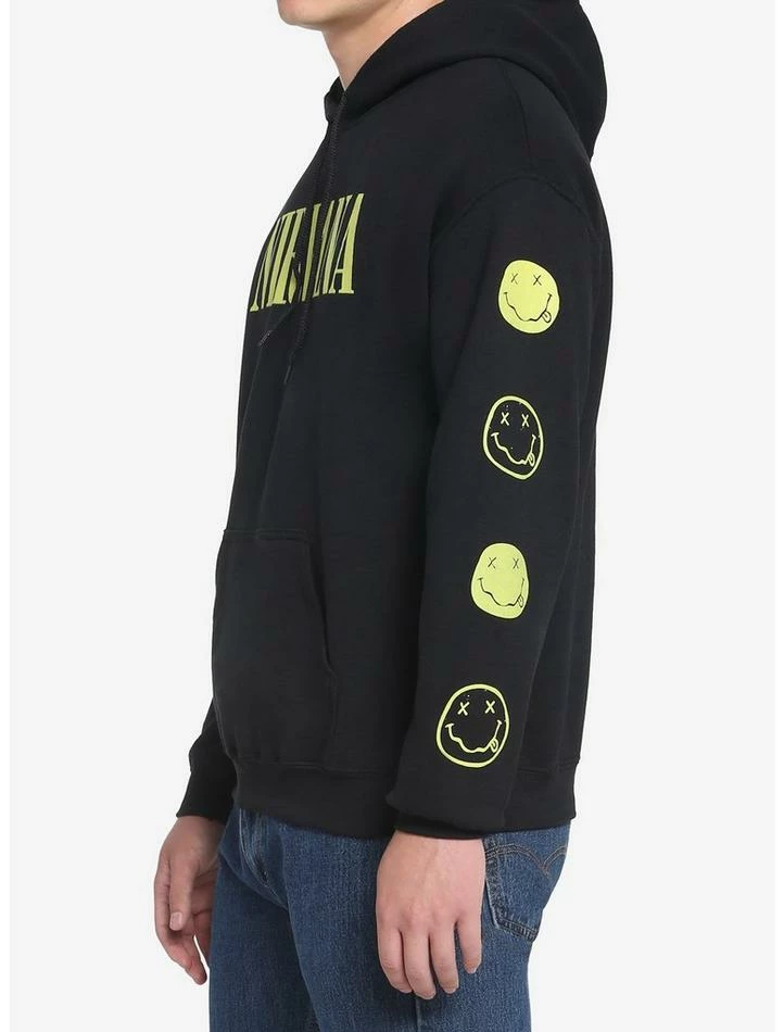 Smells like a new Nirvana hoodie for your wardrobe! This hoodie is perfect for all Nirvana fans, featuring their band name on the chest and alternating colors of their signature smiling logo down one sleeve. Drawstring cords and kangaroo pocket.