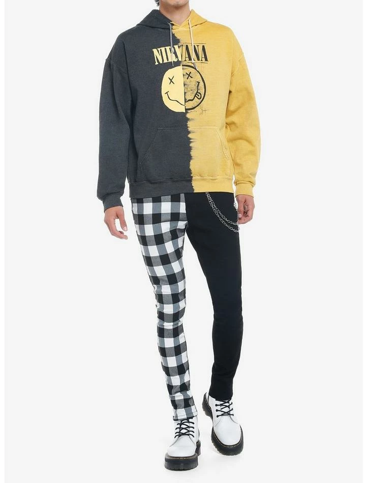 Your fave band, Nirvana, is ready to take you into colder temps with this hoodie. It features a black and yellow split dye with the band’s text logo and the smile logo on the front. Drawstring hood and front kangaroo pocket.
