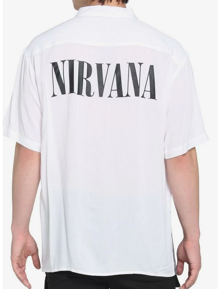 Tired of the band tee look? Class up your ‘fit and trade in your tee for a woven button-up, instead! This Nirvana shirt features a black and white photo of the band on the front, plus their text logo printed across the back.ย