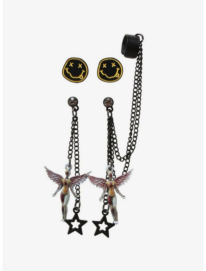 In Utero your fave Nirvana album? Now you can rock the iconic angel from the album cover with this Nirvana earring set! Featuring studs of their smile face logo, plus drop earrings with angel and star charms and a matching cuff.