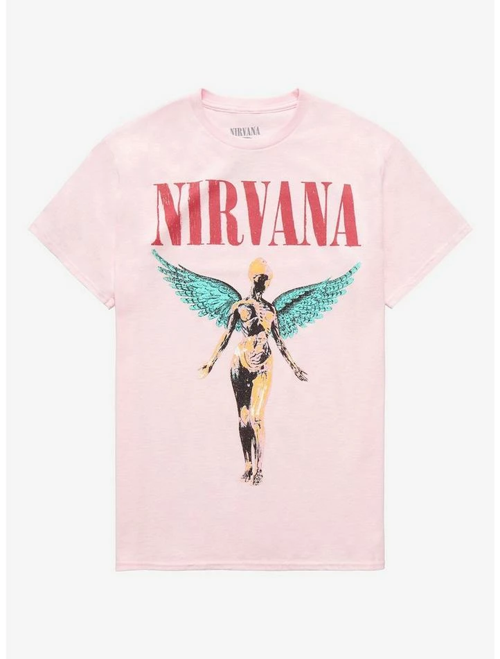 We’re calling this a remix of the classic In Utero tee.This Nirvana style comes in pastel pink, with a pastel colored In Utero angel and pink band logo.