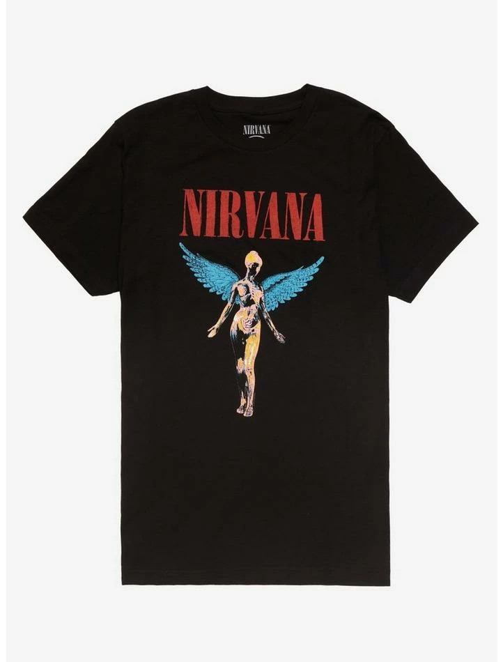 Recorded in 2 weeks with few studio embellishments as an attempt to sharply contrast the slick production of its previous album Nevermind, Nirvana’s 1993 LP In Utero gave us classic tracks like “Heart-Shaped Box” and “All Apologies.” This tee features the album artwork and band logo.