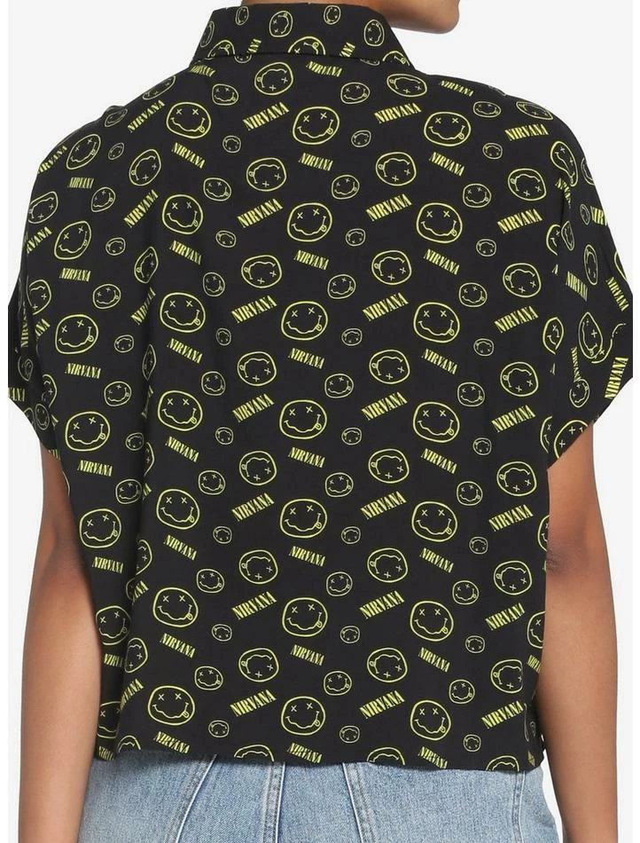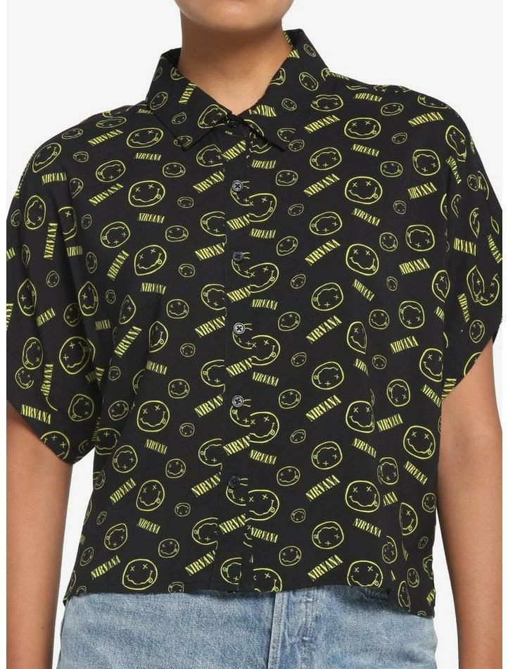 Show off your teen spirit by rocking a new Nirvana shirt! This cropped, woven button-up has a boxy fit and features an allover print of the band’s name and their iconic smile face logo.
