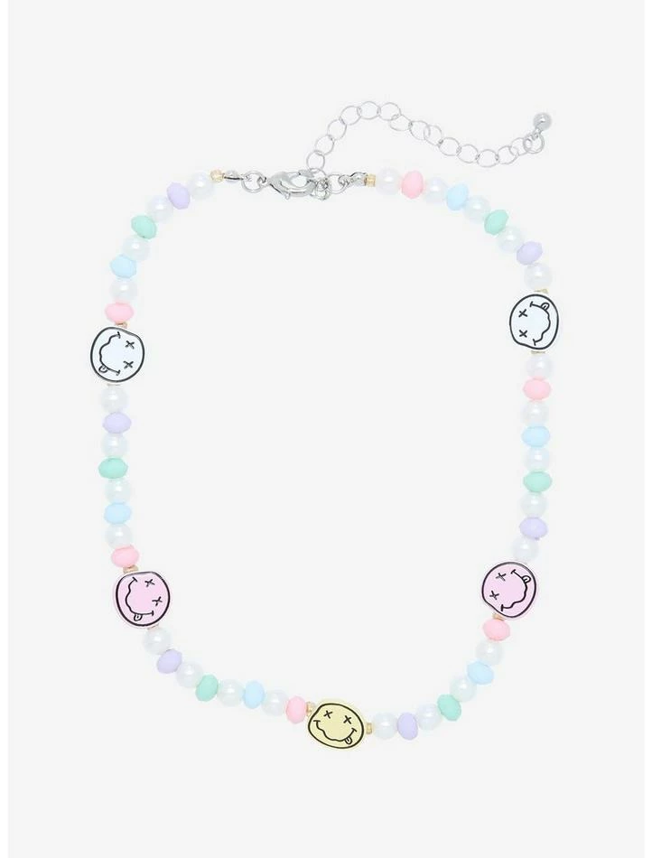 Come as you are, and with this super cute choker on! Are you a fan of Nirvana? This choker necklace is sure to be a standout accessory in your collection, featuring pastel beads and charms of Nirvana’s signature logo throughout.