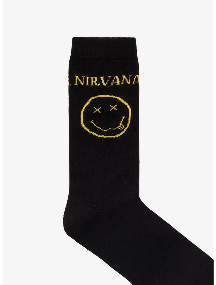 There’s no better way to rep Nirvana than rockin’ their signature smiling logo from head to toe! You’ll be smelling like teen spirit with this pair of crew socks, featuring the band name up top and their iconic smiling logo on the outer facing side.