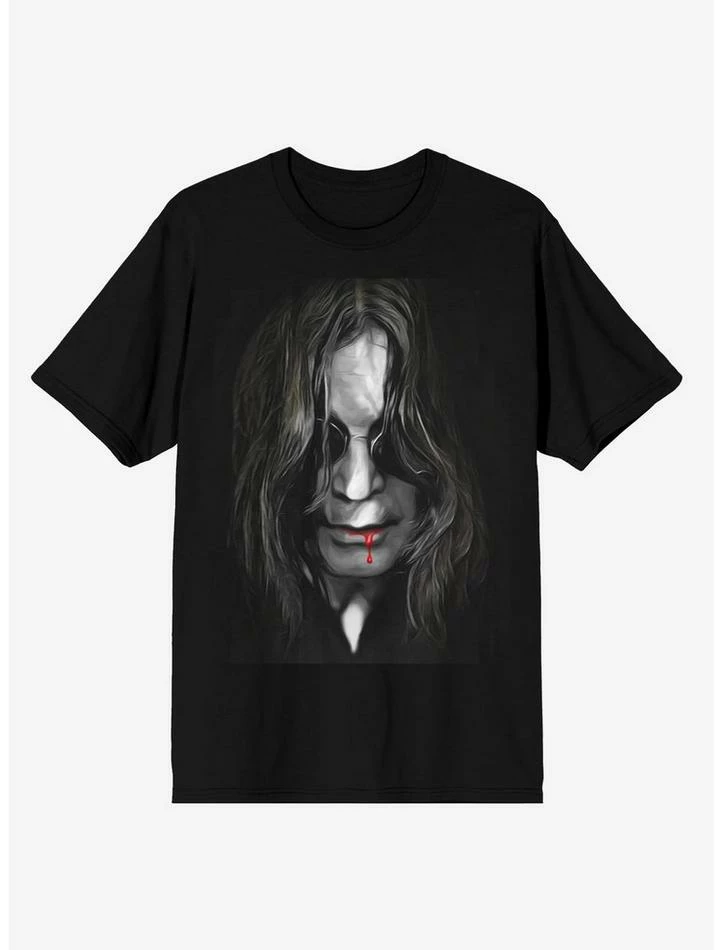 All hail the Prince of Darkness! This Ozzy tee shows a black-and-white portrait of the iconic rocker with a bright red drop of blood coming out of his mouth.