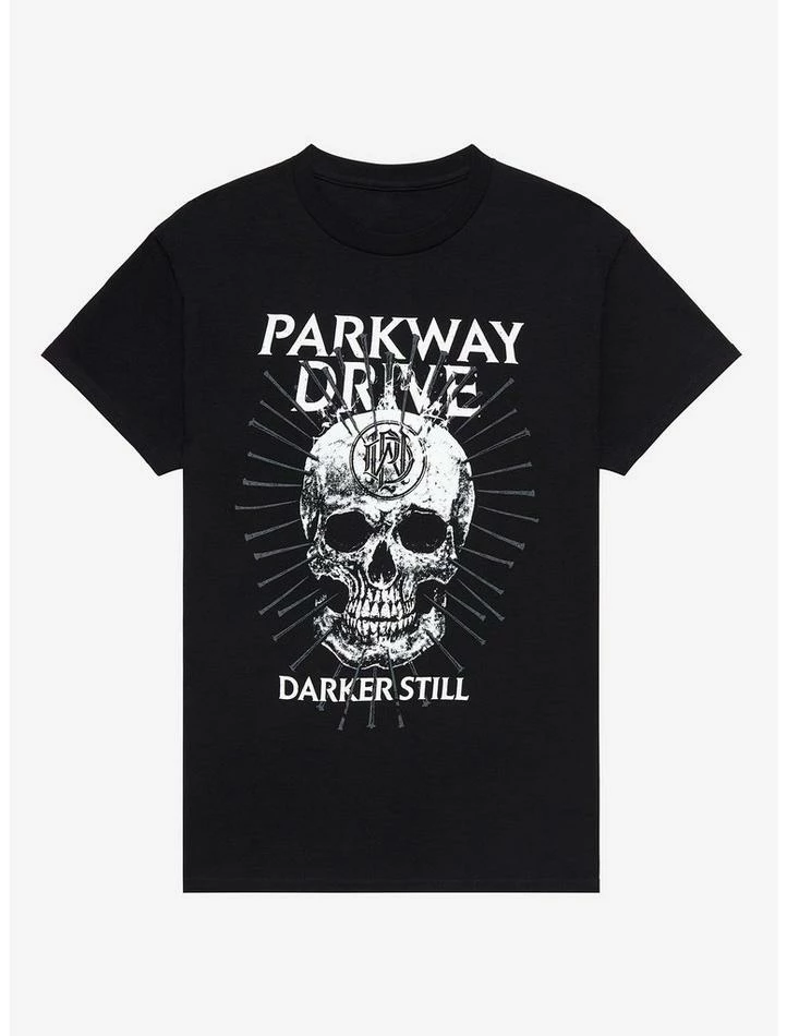 Can’t stop cranking Parkway Drive’s Darker Still (2022) LP? Then it’s time you grabbed a tee repping the album. This one has a skull with nails coming out of it, with the album name and the band name below and above.