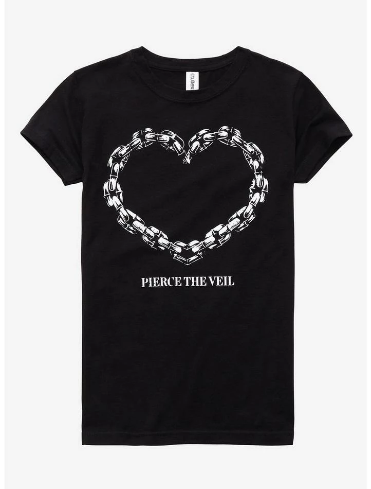 ย Do you have a bulletproof love for Pierce the Veil? Keep it protected with the heart-shaped chain on this black tee.