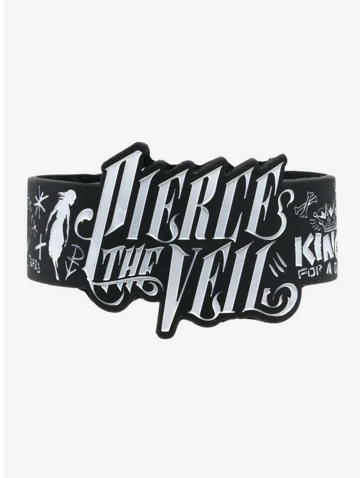 We’re bringing rubber bracelets back! Feel like a king for a day with this Pierce the Veil rubber bracelet finishing off your outfit. This wide rubber bracelet has the band’s logo in the middle, with icons and lyrics from their songs all around.