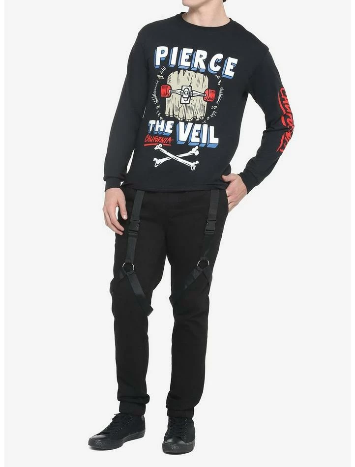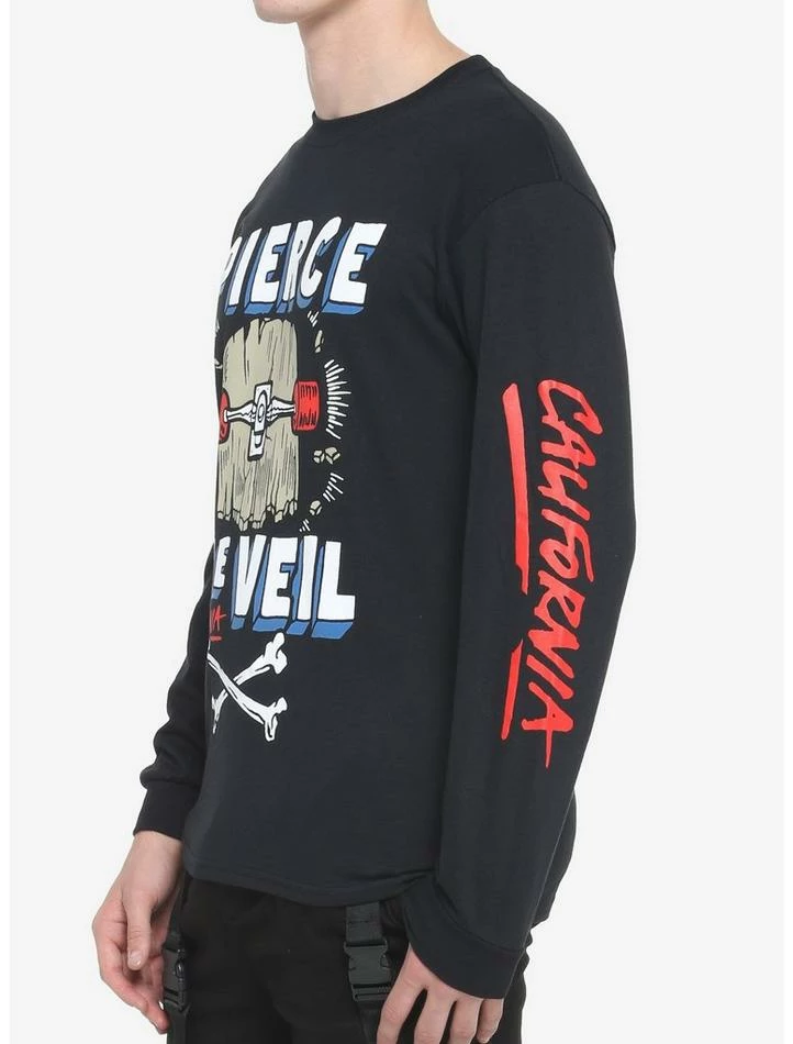 Skate on over to Pierce The Veil’s next show rocking this tee! Featuring a broken skateboard at the chest, framed by their band name and crossbones, plus “California” printed down the sleeve.